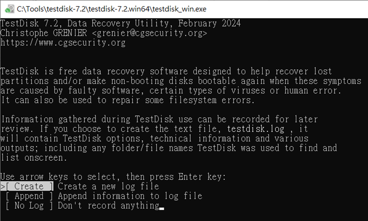 1. 執行 Testdisk,選擇是否要輸出Log記錄(如果使用 LiveCD 類,當然無法輸出)